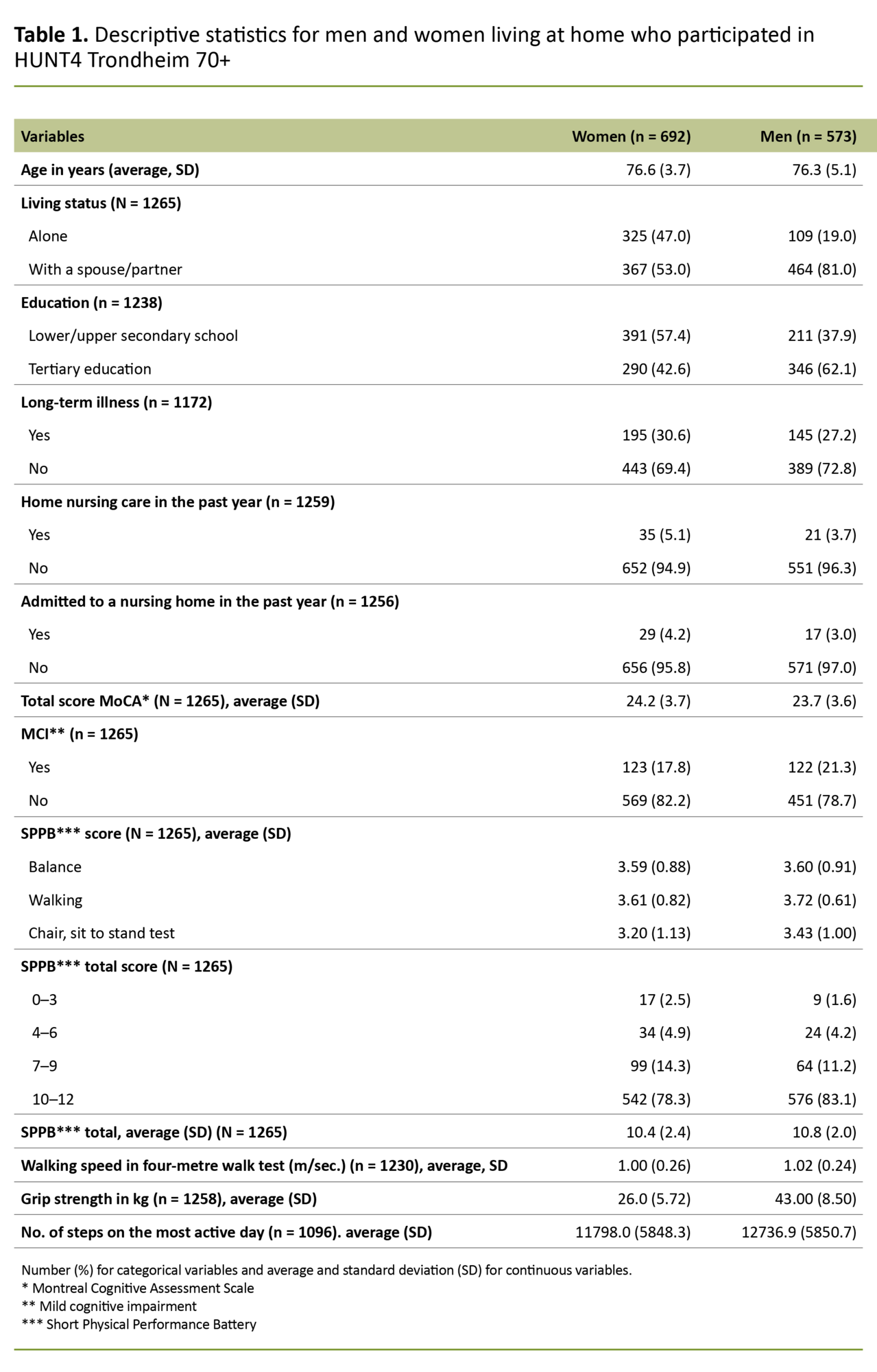 Method: A cross-sectional study using data collected from 1265 community-dwelling women and men who were aged ≥ 70 years during participation in the population study HUNT4 Trondheim 70+ in the period 2018–2019. We mapped physical and cognitive function using validated measuring instruments. The participants also provided data on grip strength and physical activity measured using an accelerometer.