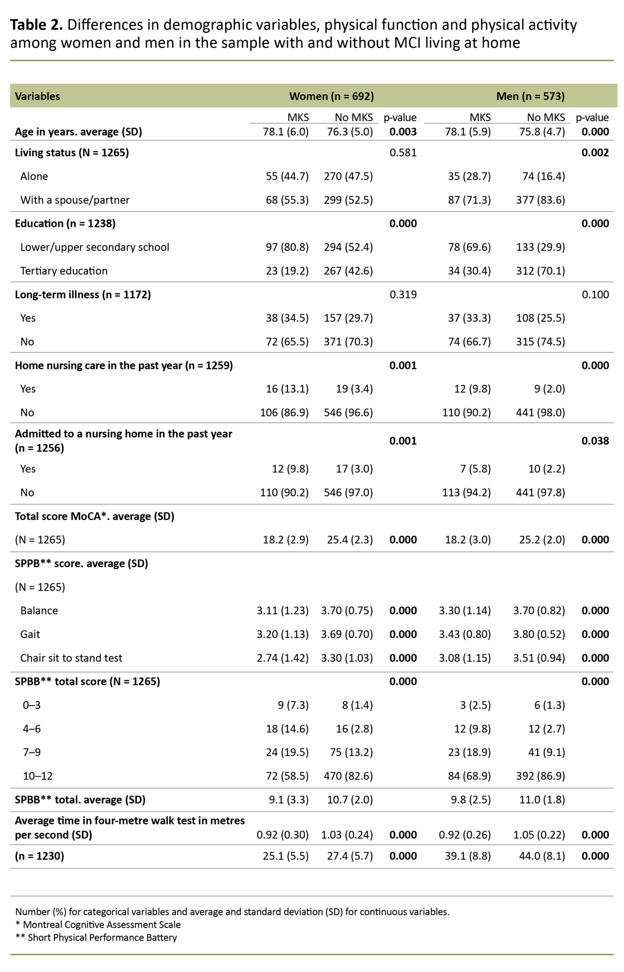 Table 2. Differences in demographic variables, physical function and physical activity among women and men in the sample with and without MCI living at home