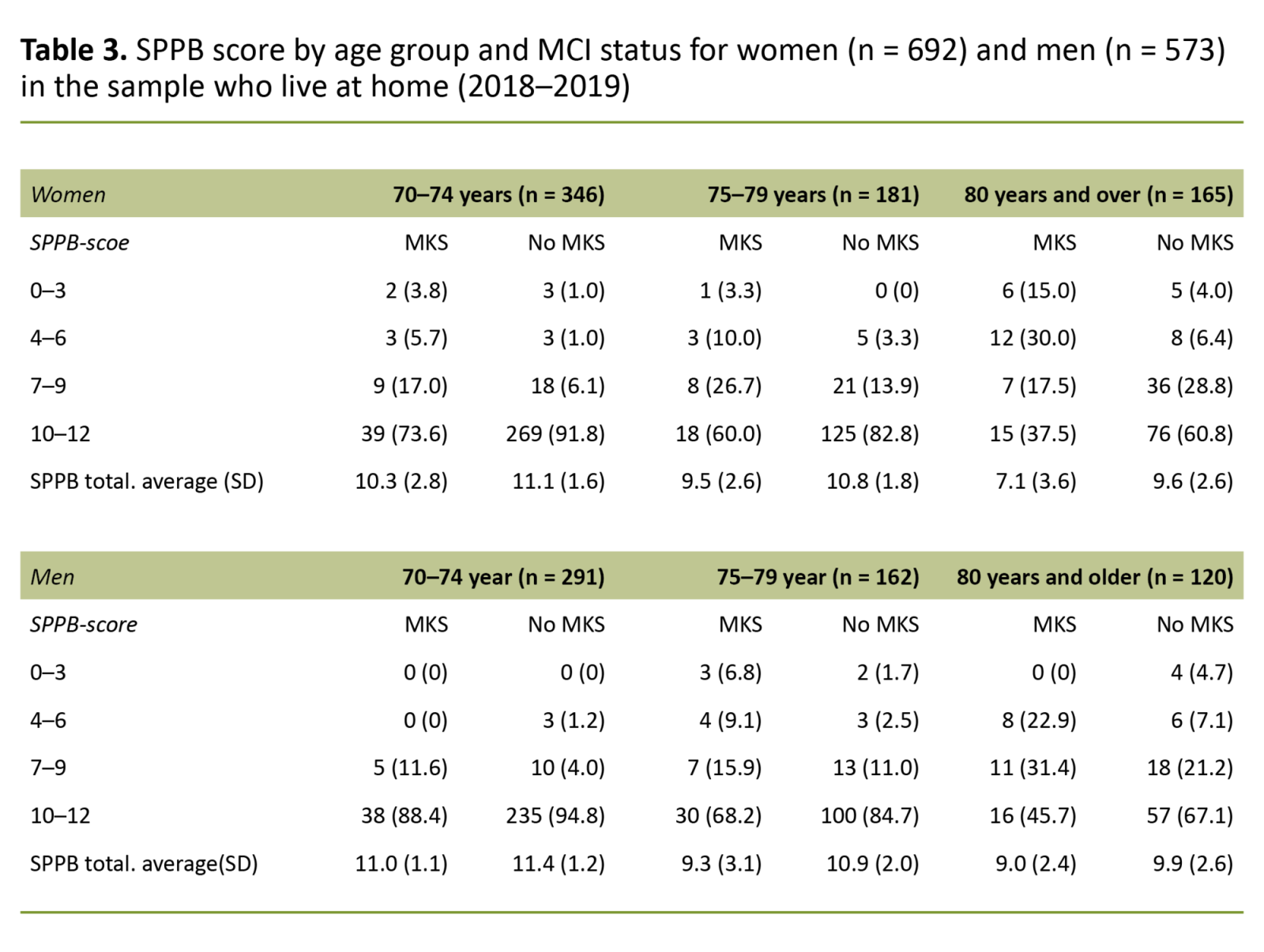 Table 3.  SPPB score by age group and MCI status for women (n = 692) and men (n = 573) in the sample who live at home (2018–19)