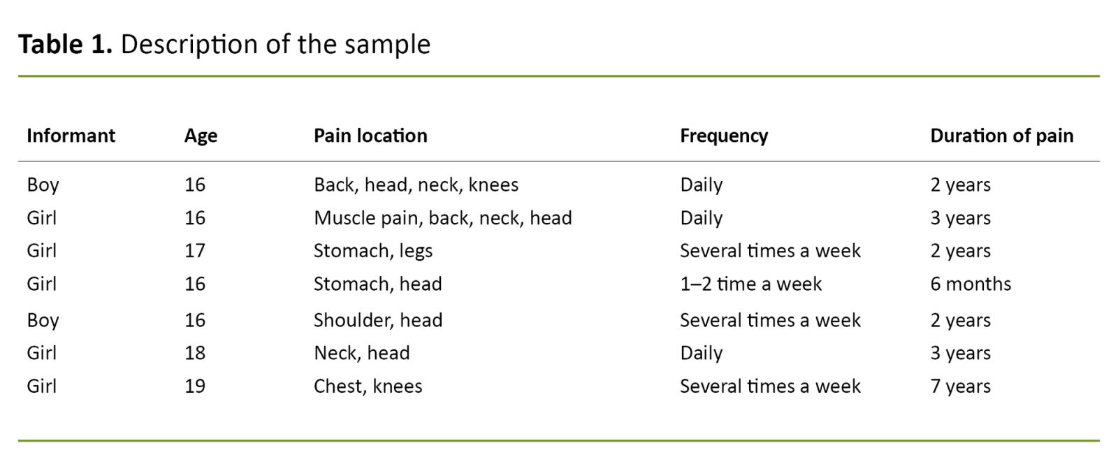 Fictitious names have been used in the presentation of all findings. All informants contributed to the study’s results. The description of the sample (Table 1) shows that all the young informants experienced pain several time a week, three of them experienced pain every day, and the majority had experienced pain over a period of two years or more.