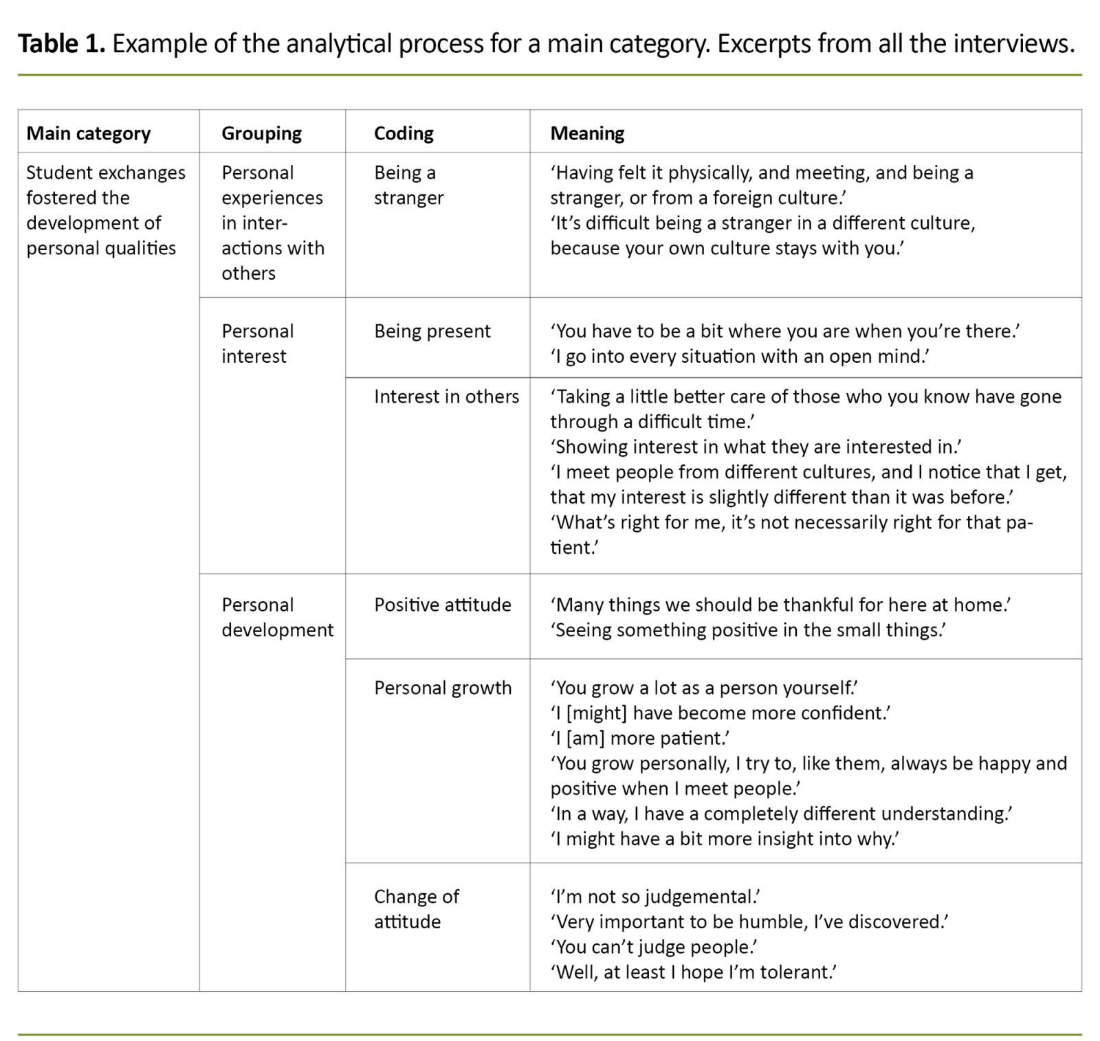 We conducted individual interviews in order to gain an insight into the impact that student exchanges had had on the nurses in the years that followed (17). The study sample was the 21 nursing students who participated in the focus group interviews in the autumn of 2015 (5).