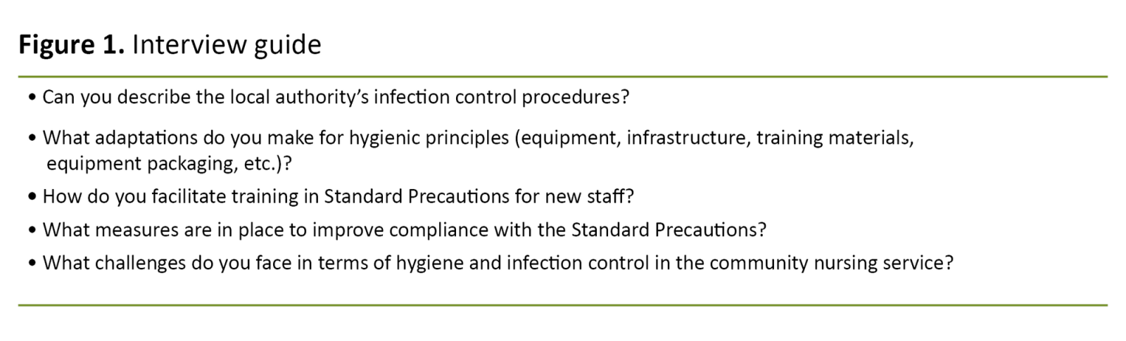 The questions in the semi-structured interview guide related to practices and staff training in Standard Precautions (Figure 1). The guide was based on previous research on compliance with infection control (14, 15, 23, 24).