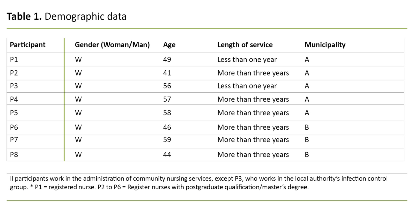 The sample consisted of nursing consultants, a nursing manager and an infection control public health nurse (Table 1). They were informed about the purpose of the study and the interviewer’s background from the community nursing service.