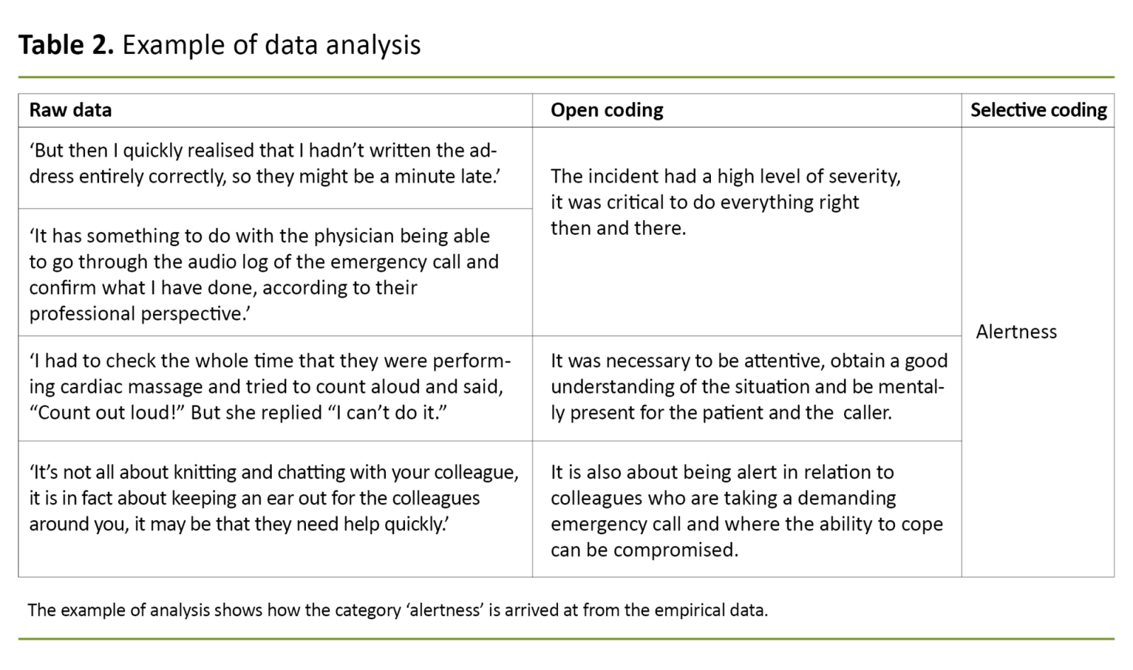 Incidents and terms that had come up in the already transcribed interviews and memos were compared between informants. The information that came to light influenced the subsequent interviews, in that we adjusted some of the interview questions to confirm or discard data. For example, the perceptions that RNs working in EMCCs found necessary for coping with a critical incident was a theme that emerged from the very first interview, and this was followed up in subsequent interviews.