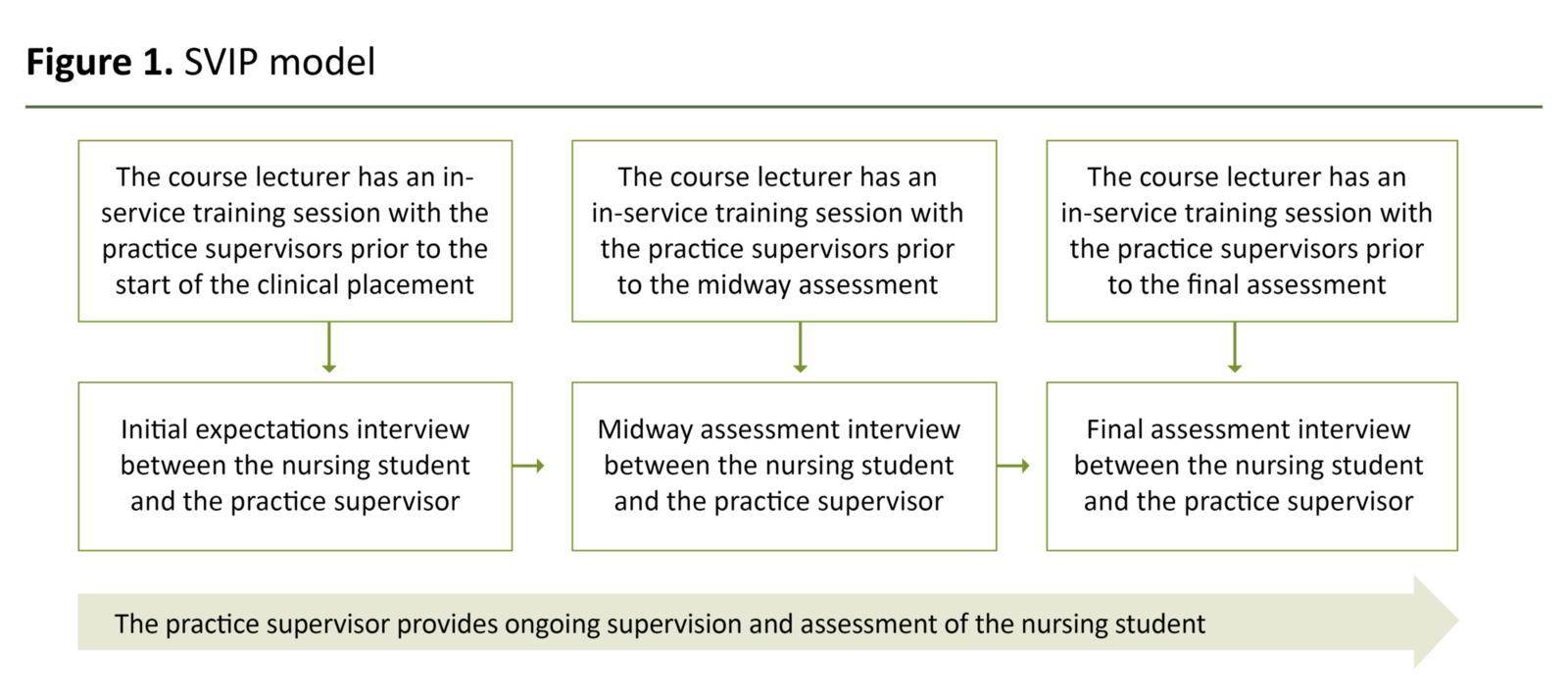 In the SVIP model, the practice supervisors meet the lecturer for in-service training three times during the clinical placement. These meetings take place at the placement institution prior to the initial, midway and final assessment interviews. In the in-service training sessions, practice supervisors share their experiences with supervising nursing students and receive guidance on their supervision.