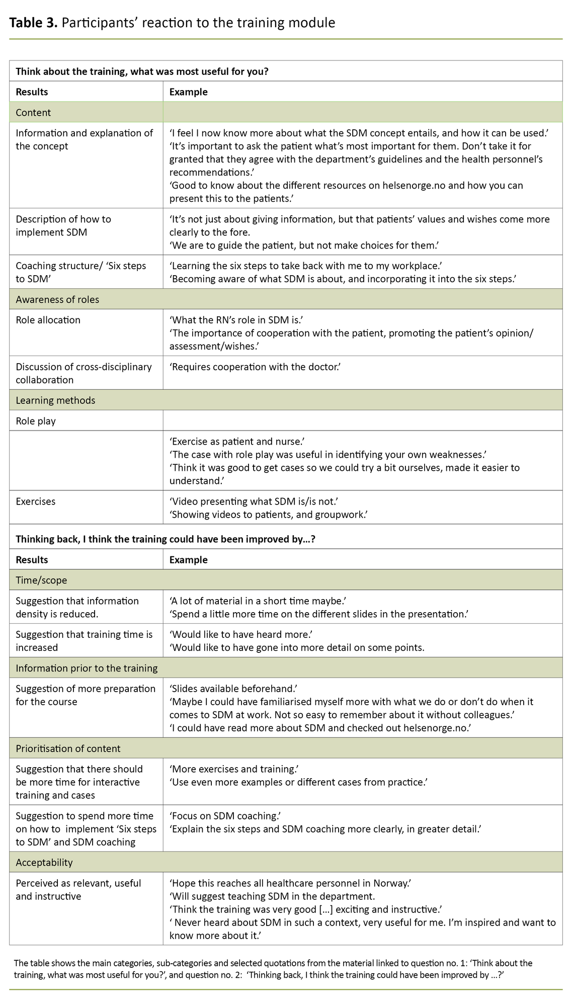 Furthermore, the participants stated that they believed it was useful for several people from the same department to take part in the training together. One said: ‘Get more of my nursing colleagues involved.’ Another said: ‘Maybe I could have familiarised myself more with what we do or don’t do when it comes to SDM at work. Not so easy to remember about it without colleagues.’