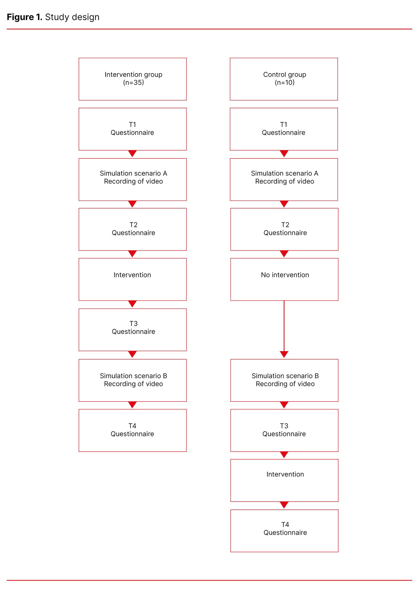 The intervention group underwent the de-escalation training after being exposed to the first test scenario (simulation scenario A) and before being exposed to the second test scenario (simulation scenario B), while the control group underwent the training after exposure to both test scenarios (Figure 1). The intervention lasted for 50 minutes.