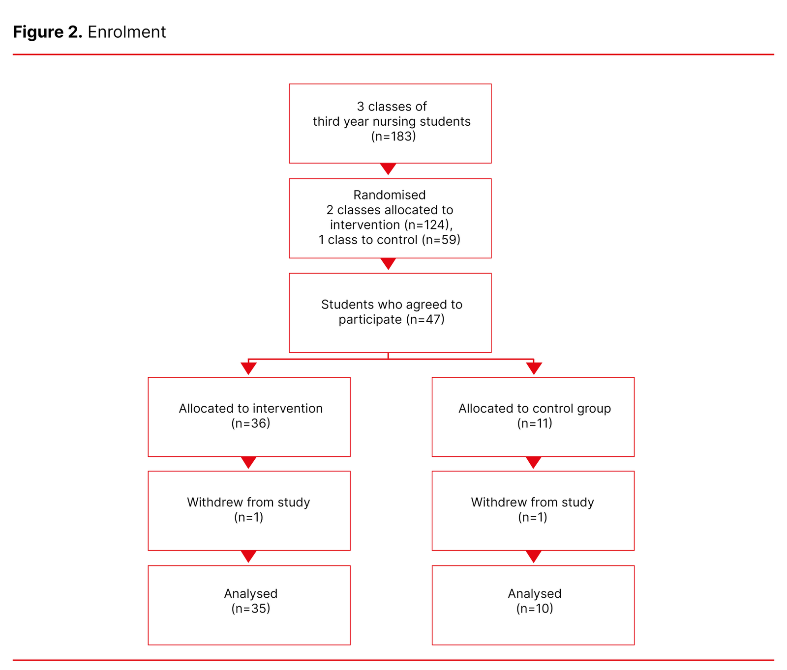 A self-selection sampling approach was used in the three clusters (classes) of third-year nursing students. The three classes consisted of 61, 63 and 59 students, respectively. A flow diagram of the study participants is outlined in Figure 2.