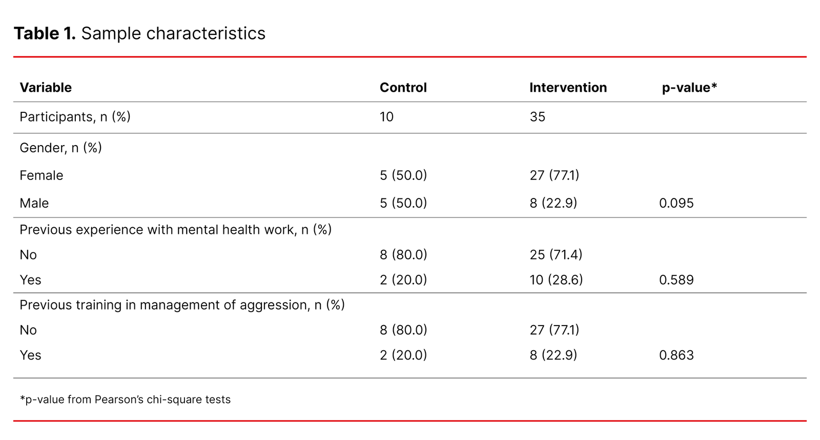 More than 70% had no previous training in the management of aggression. Ten were allocated to the control group and 35 to the intervention group. The size of the control group was small, as the recruitment from this particular class was lower than the other clusters (Table 1). Participant characteristics were similar in the groups.