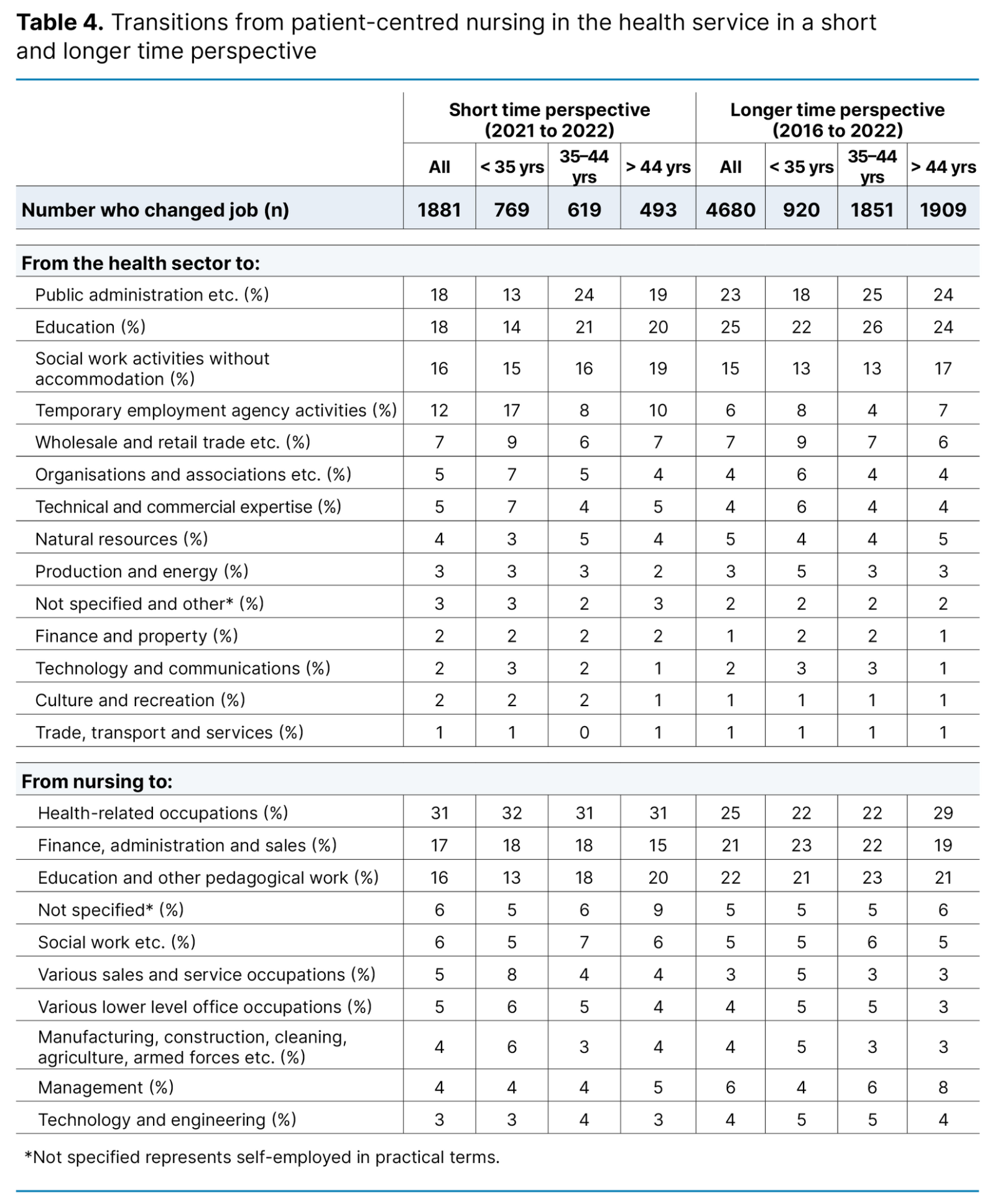 Method: Using descriptive analyses of register data from Statistics Norway, we shed light on the current situation. We examine transitions to and from patient-centred nursing in the health and care industry in a short and longer time perspective.