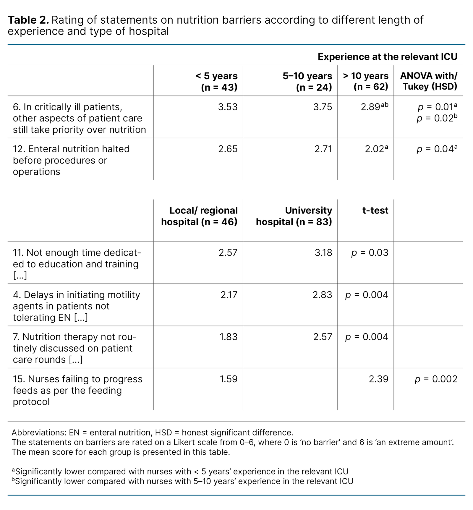 The barrier ‘In critically ill patients, other aspects of patient care still take priority over nutrition’, was rated lower (p < 0.05) by nurses with over 10 years’ experience compared with groups with 5–10 and 0.5–10 years’ experience.