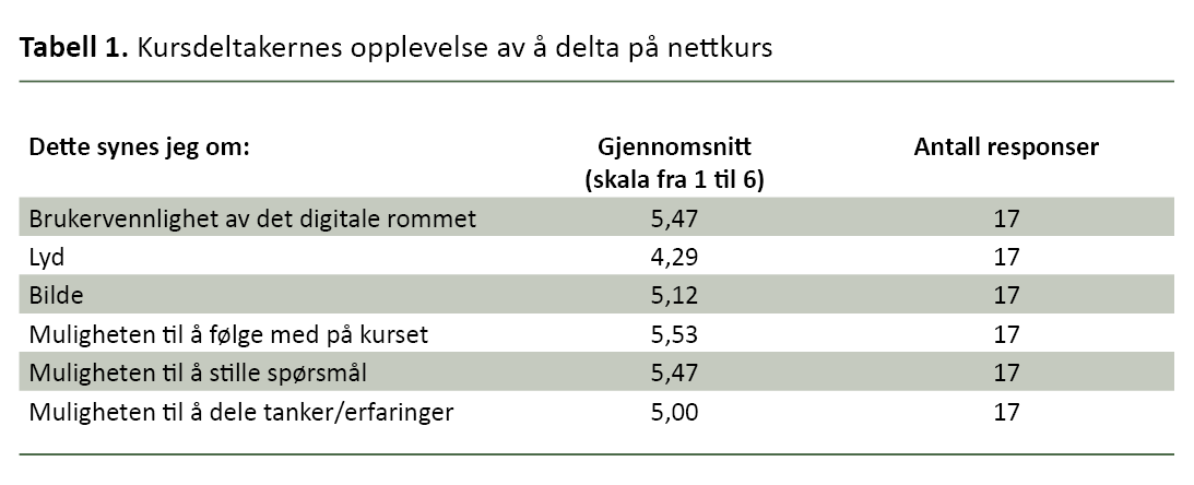 Alle kursdeltakerne svarte på undersøkelsen. De fleste var fornøyde med brukervennligheten av det digitale rommet, bildekvaliteten og muligheten til å følge med på kurset og til å stille spørsmål (se tabell 1). Deltakerne var noe mindre fornøyde med lyden og med muligheten til å dele tanker og erfaringer.