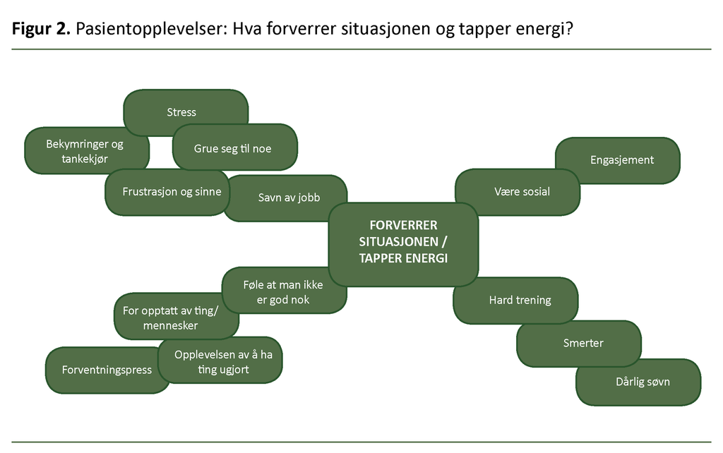 I samtalegruppen benytter vi flere av elementene som oppslagsverket UpToDate anbefaler under behandling av vedvarende symptomer etter covid-19 (10). Sykepleieren hjelper pasientene til å bli bevisst på hva som gir og tapper energi hos den enkelte. Sykepleieren ber pasientene tenke igjennom hva som bedrer og forverrer situasjonen (figur 1 og 2).