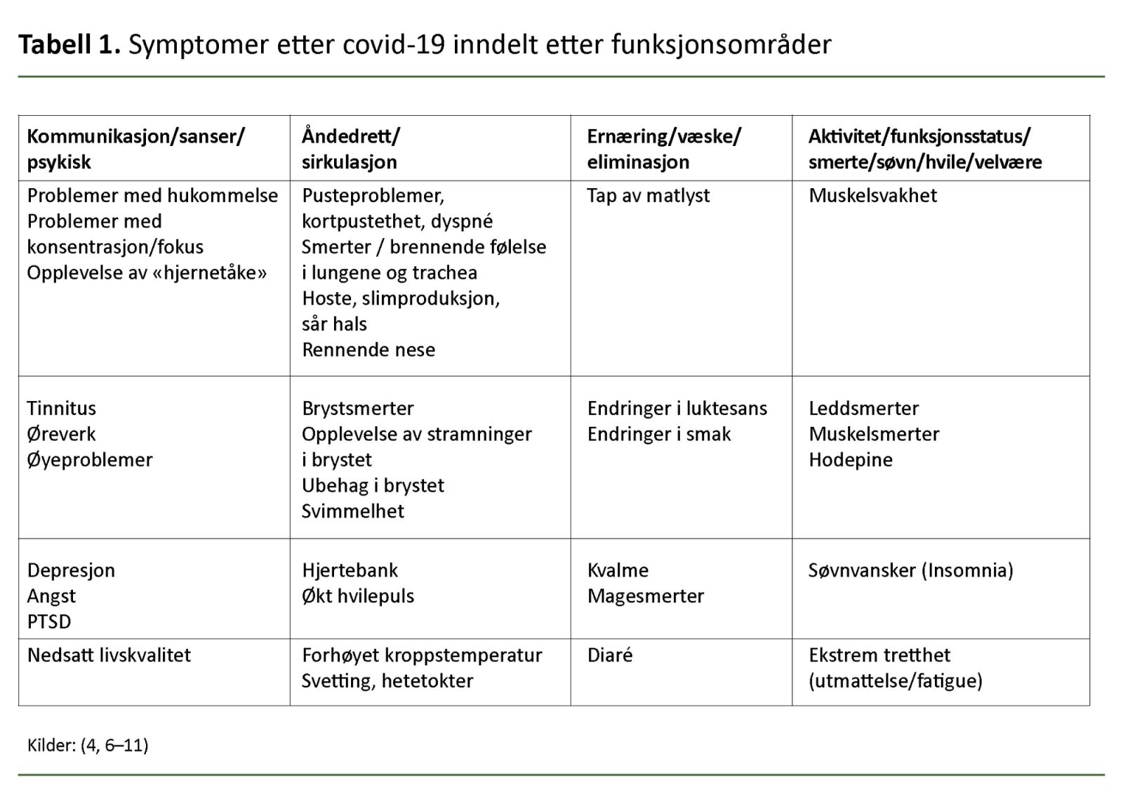 Vi har som sykepleiere erfart at pasientene som kommer til rehabilitering etter covid-19, sliter med et komplekst bilde av både fysiske, psykiske og kognitive symptomer. Tabell 1 viser de ulike symptomene som kan være vedvarende etter covid-19 (4, 6–11).
