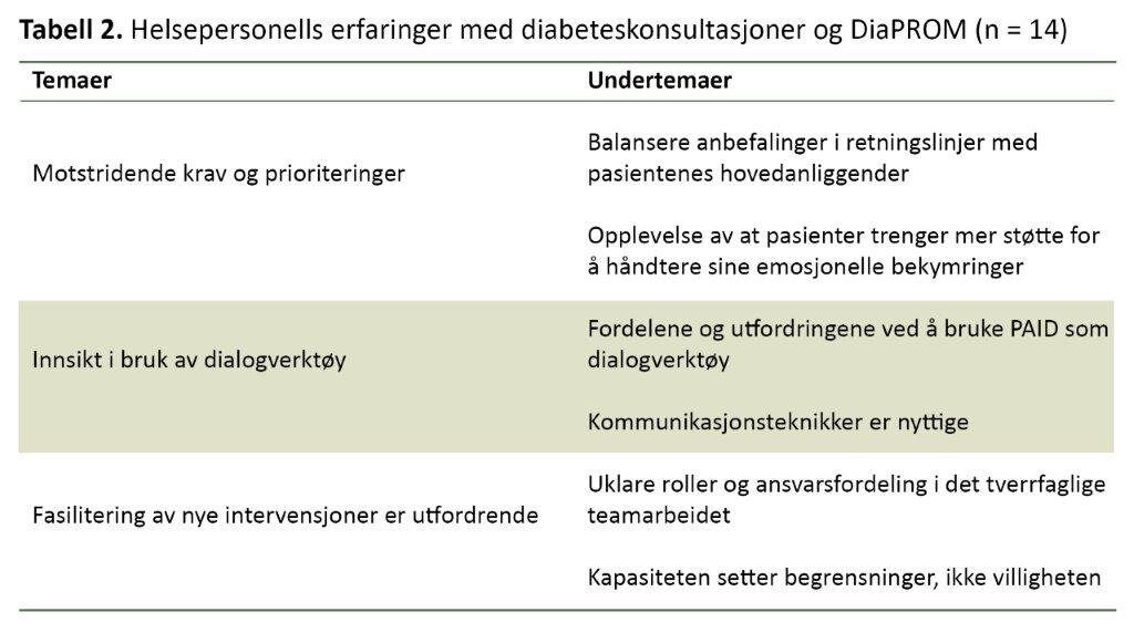I den fjerde delstudien utførte vi individuelle intervjuer med ni leger og fem diabetessykepleiere som bidro i pilotstudien (21). Vi spurte om deres erfaringer med diabeteskonsultasjoner generelt og DiaPROM-intervensjonen spesielt. Også her benyttet vi tematisk analyse og identifiserte tre temaer, hvert med to undertemaer (tabell 2).