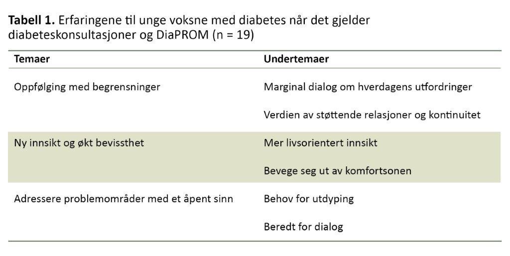 I den tredje studien intervjuet vi 19 unge voksne med diabetes type 1 som deltok i pilotstudien (20). Vi spurte om deres erfaringer med poliklinisk oppfølging generelt samt det å besvare elektroniske PROM og bruke PAID som dialogverktøy i konsultasjoner. Dataene analyserte vi ved hjelp av tematisk analyse. Vi identifiserte tre temaer, hvert med to undertemaer (tabell 1).