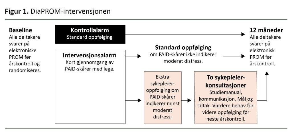 Deltakerne i DiaPROM-prosjektet besvarte PAID og noen andre spørreskjemaer elektronisk før de skulle til årskontroller for diabetes (16). Legene gikk igjennom PAID-skåren i konsultasjonen. De som rapporterte fra moderat til alvorlig forhøyet distress, fikk tilbud om tilleggsoppfølging hos en diabetessykepleier.