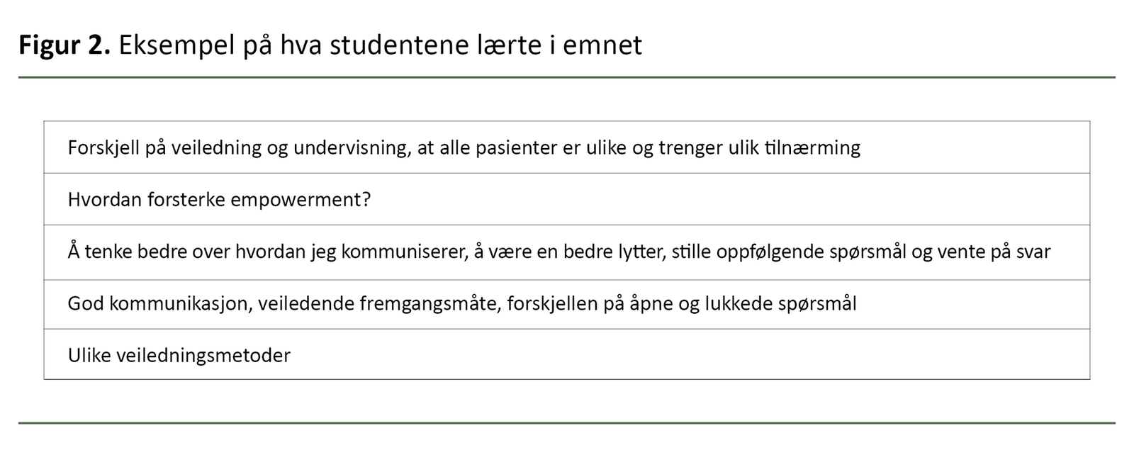 Tilbakemeldingen etter endt undervisning bekreftet at studentene blant annet hadde lært forskjellen på undervisning og veiledning og betydningen av brukermedvirkning.