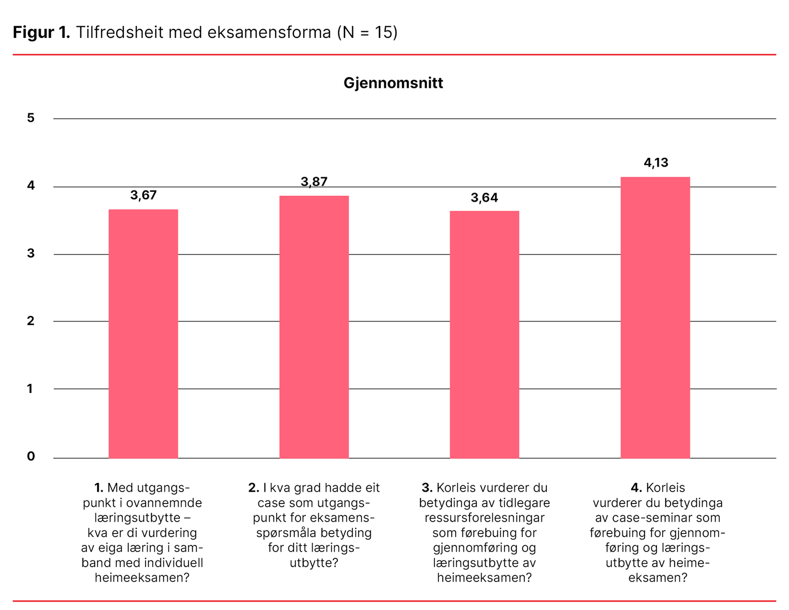 Det var 15 av 18 studentar som leverte utfylt spørjeskjema i første studieveke etter gjennomført eksamen (svarprosent 83). Figur 1 viser gjennomsnittlege skårar for spørsmål 1–4. Jamt over var studentane svært nøgde med eiga læring i samband med individuell heimeeksamen.