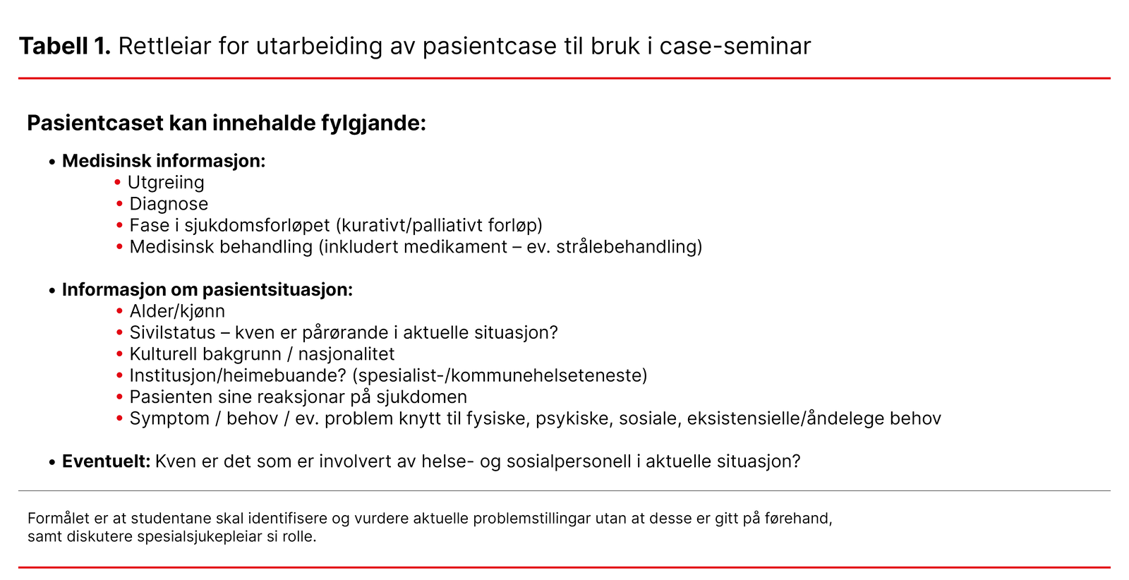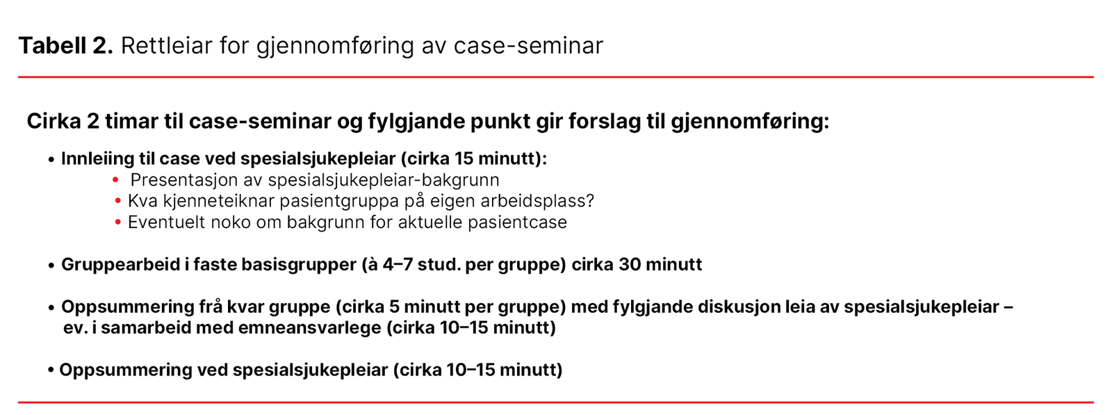 Ein spesialsjukepleiar innan det aktuelle fagfeltet deltok i samarbeid med emneansvarleg og studentar i refleksjon rundt aktuelle case i seminarform, etter ein utarbeidd rettleiar for seminaret (tabell 2). Studentane hadde fått tilgang til case på læringsplattforma ein til fem dagar forut med høve til å lese aktuell litteratur.