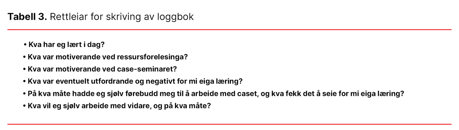 Studentane skreiv ned erfaringane og refleksjonane sine i loggbøker som datasamlingsmetode gjennom studieåret (9). Studentane fekk rettleiande spørsmål til loggskrivinga relatert til erfaringar med case-seminara i kombinasjon med ressursforelesingane (tabell 3).