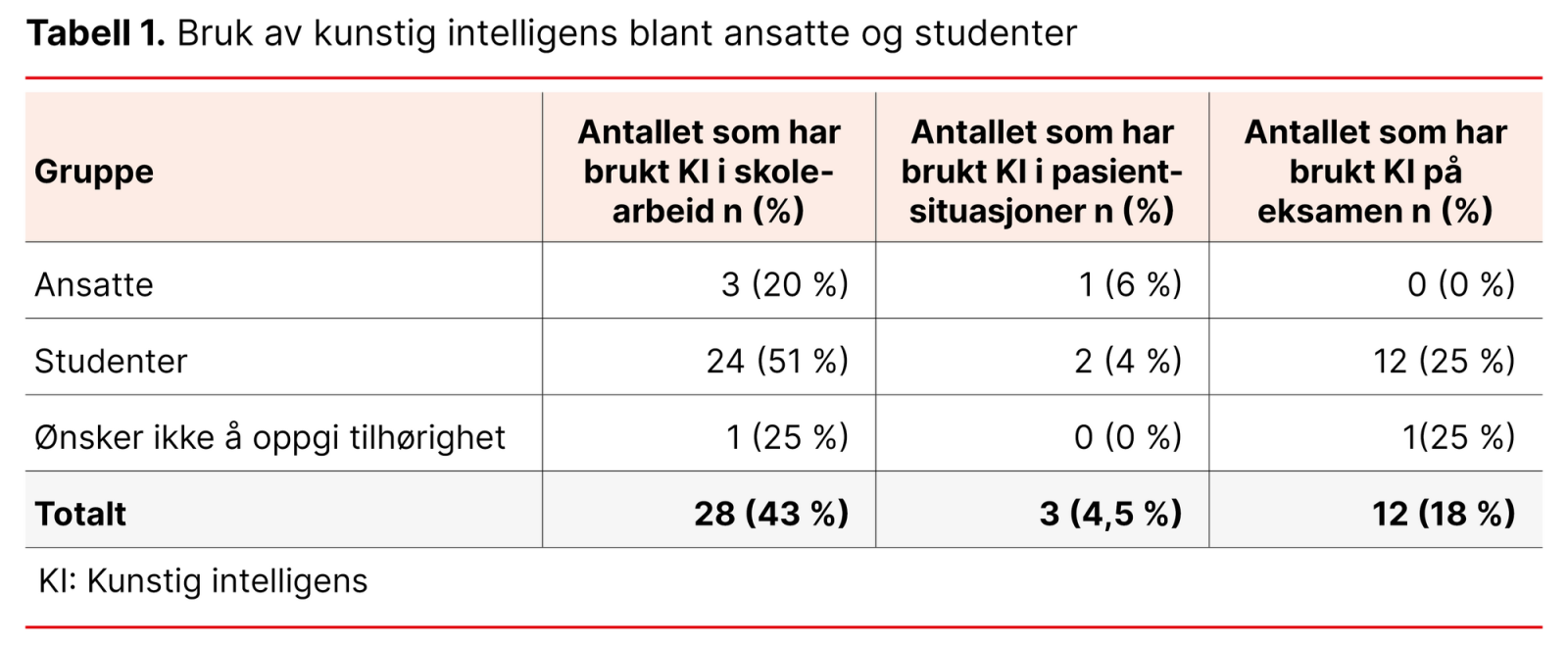Selv om det ikke var tillatt, opplyste tolv studenter at de hadde brukte ChatGPT på eksamen, hvorav åtte gikk på intensivutdanningen. De øvrige som brukte KI under eksamen, tilhørte andre studieretninger eller ville ikke oppgi tilhørighet.