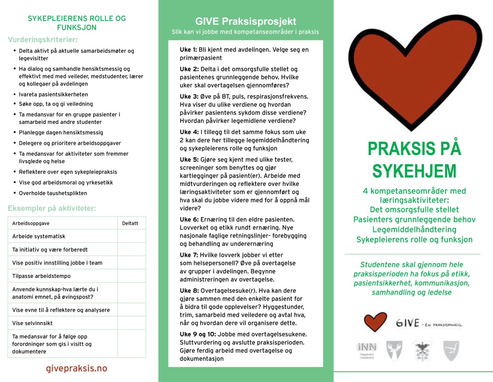 I denne artikkelen beskriver vi hvordan studenter ble presentert for vurderingskriterier og arbeidsoppgaver i en GIVE-lommefolder. GIVE står for gjensidig involvering og villet endring. Lommefolderen sikrer at veiledere, lærere og studenter får den samme forståelsen for hva studentene skal arbeide med i sin første praksisperiode. Vi gjennomførte fokusgruppeintervjuer med 35 sykepleierstudenter som har hatt sin første praksisperiode i sykehjem. De var svært fornøyde med GIVE-lommefolder som hjelpemiddel.
