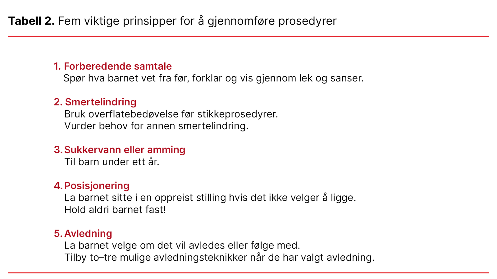 Tabell 1 viser noen generelle råd for kommunikasjon. I tillegg anbefaler vi e-læringskurset Kommunikasjon og samarbeid med barn og unge ved stikkeprosedyrer. Kurset bygger på nyere forskning og dekker fem viktige prinsipper (23), som er presentert i tabell 2.