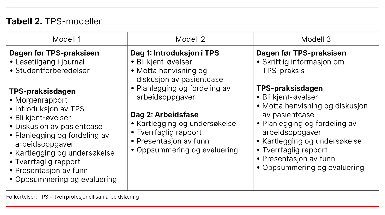 Modell 1 ble brukt ved oppstart av nye runder med TPS-praksis i januar 2023. Dagen før praksisen fikk studentene muntlig informasjon om TPS og tilgang til pasientens journal. Studentene ble oppfordret til å forberede seg på tverrfaglig diskusjon og teamarbeid.