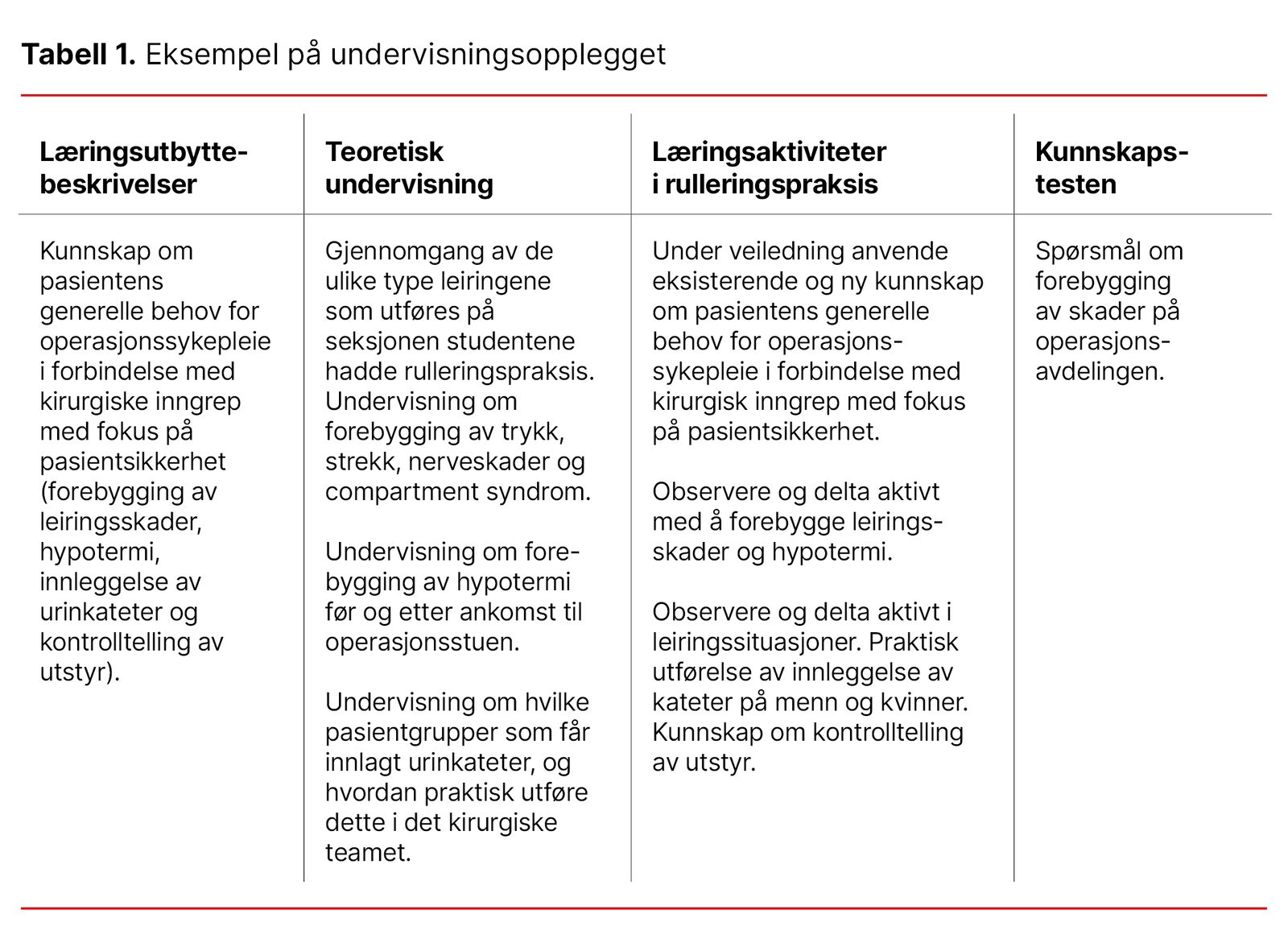 Undervisningsopplegget ble utviklet med utgangspunkt i nasjonal retningslinje for sykepleierutdanningen og studieplanen for kirurgisk praksis ved Oslomet – storbyuniversitetet (3, 10).
