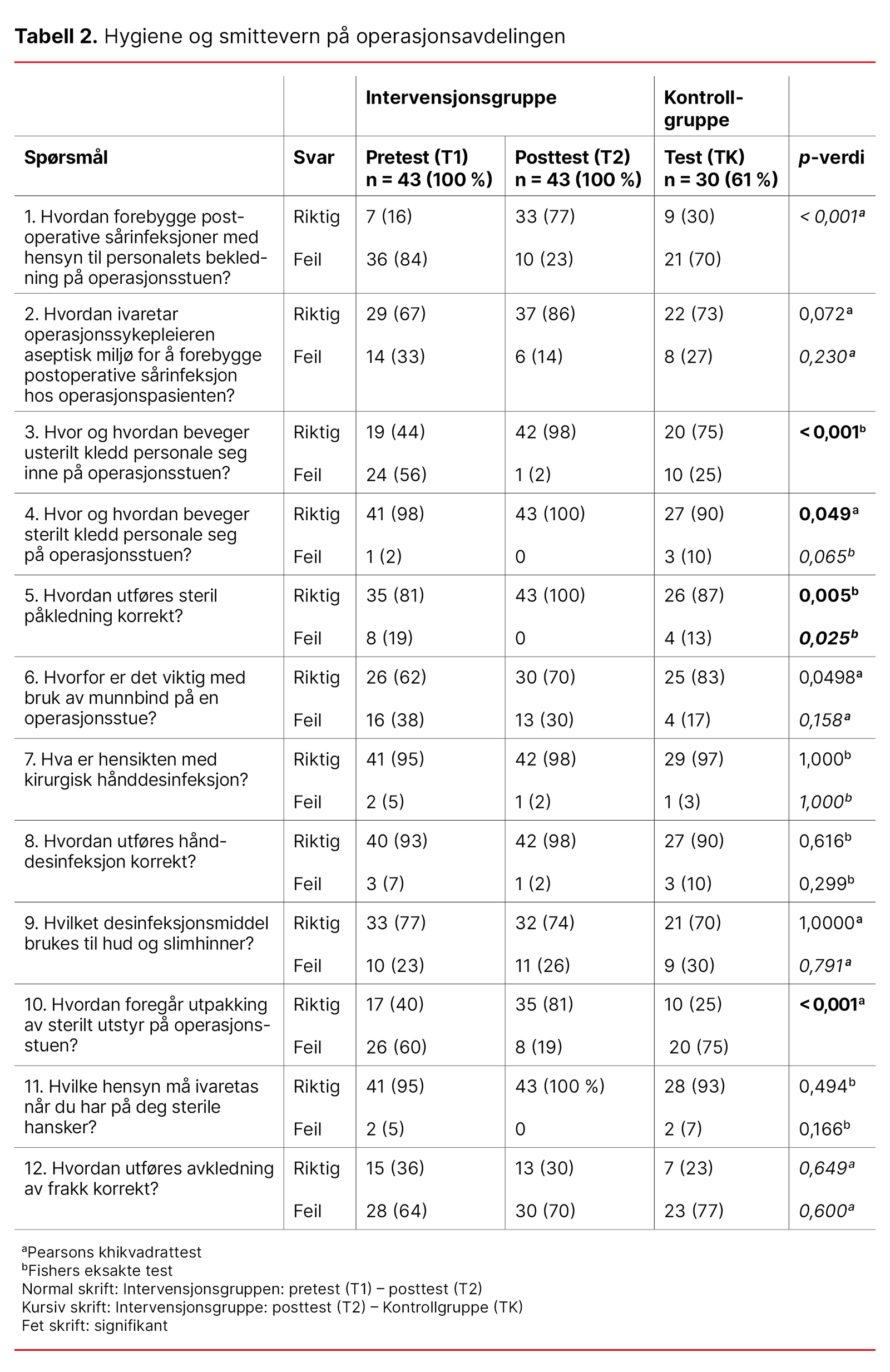 Studien viste at sykepleierstudentene som deltok i det spesielle undervisningsopplegget, fikk betydelig mer kunnskap om hygiene og smittevern, spesielt hvordan man forebygger postoperative sårinfeksjoner, forebygging av preoperative skader og kunnskap i kommunikasjon og dokumentasjon (se tabell 2).