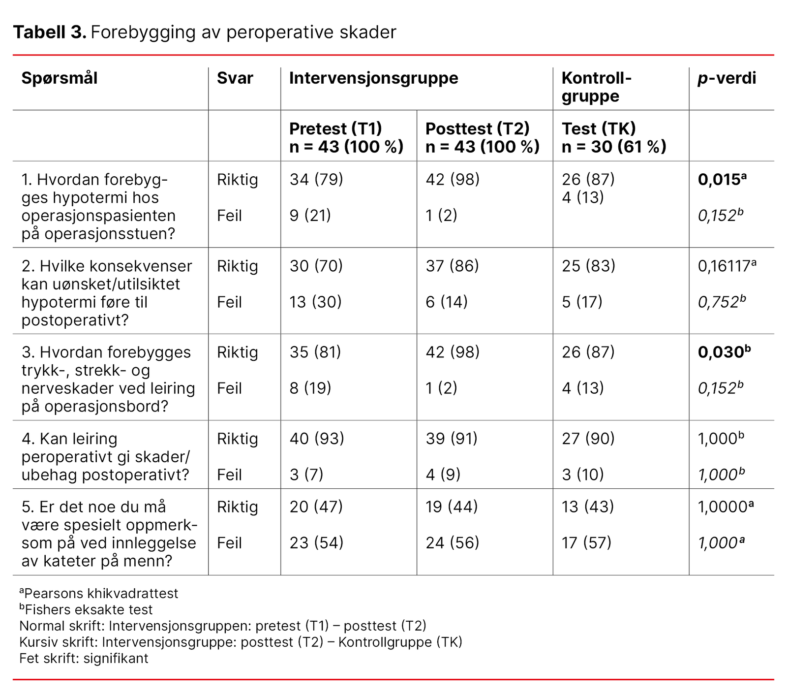 De hadde bedre kunnskap om forebygging av hypotermi og trykk-, strekk og nerveskader ved leiring på operasjonsbordet (T2), sammenliknet med før undervisningsopplegget (T1). De kunne også mer enn kontrollgruppen (TK) (se tabell 3).