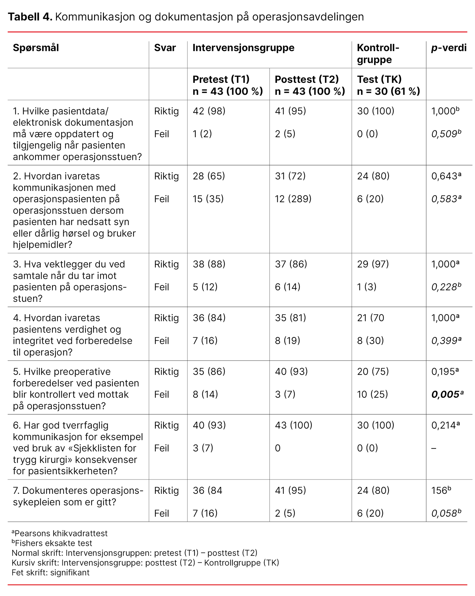 Alle studentene, både de som deltok i undervisningsopplegget, og de som ikke deltok, svarte riktig på spørsmålene om kommunikasjon, bruken av «Sjekklisten for trygg kirurgi» og dokumentasjon.