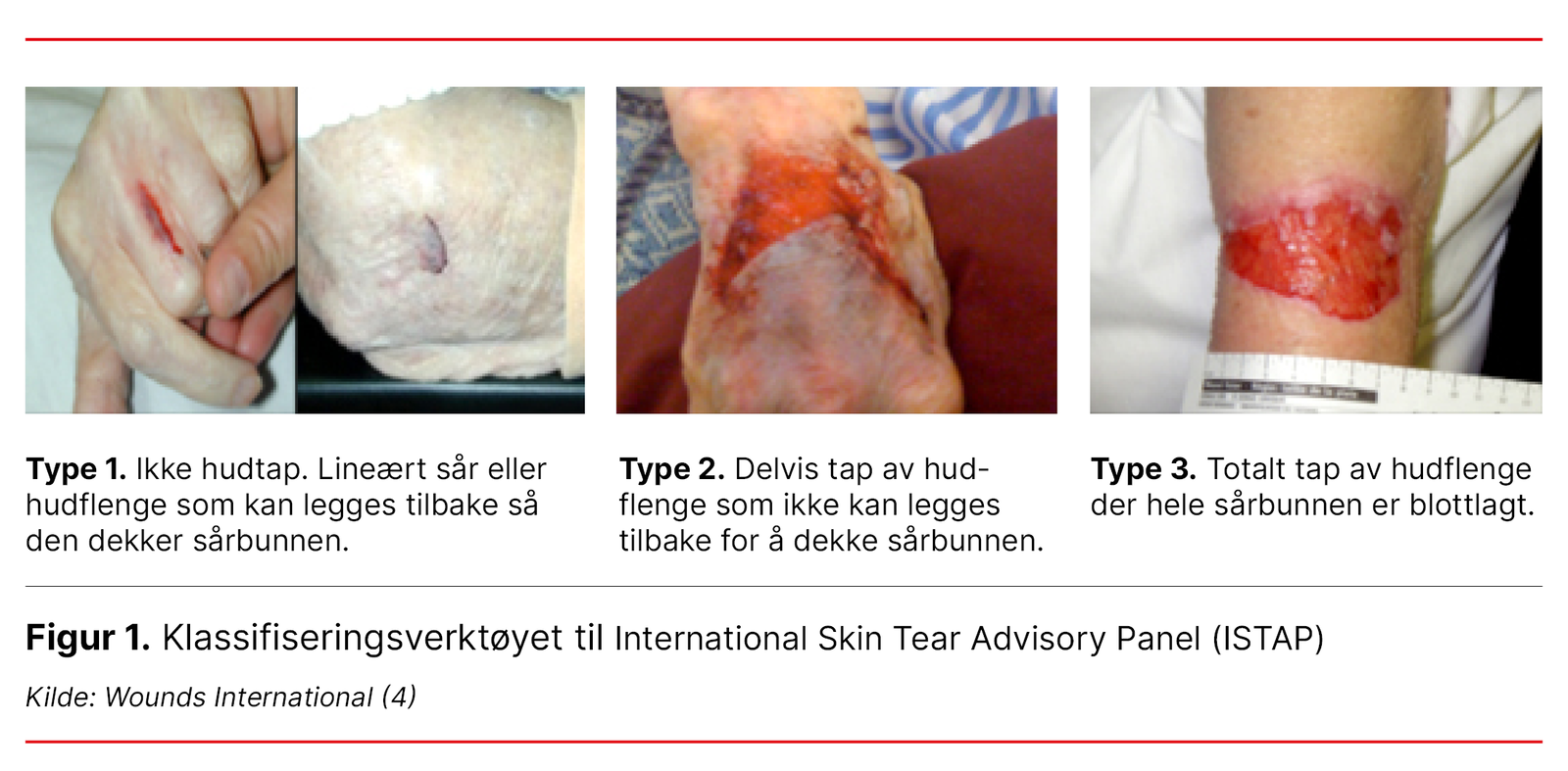 18.       LeBlanc K DL, Samuriwo R. Skin tears and skin tone [internett]. London: Wounds International; 3. januar 2024 [hentet 26. mars 2025]. Tilgjengelig fra: https://woundsinternational.com/made-easy/skin-tears-and-skin-tone/
