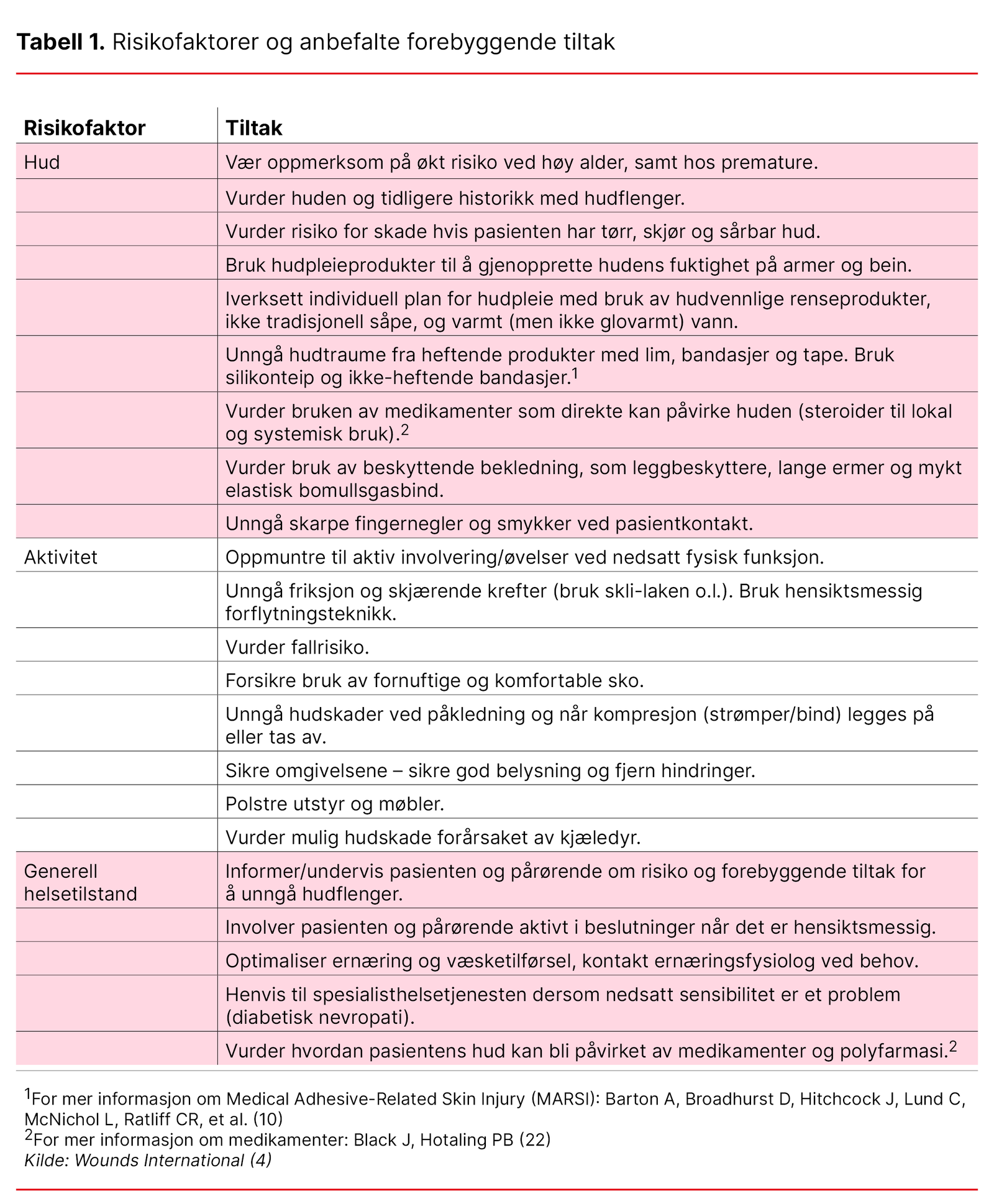 Det finnes likevel mange kjente risikofaktorer som helsepersonell kan kartlegge og gjøre noe med for å unngå sår. Risikoen for hudflenger henger ofte sammen med pasientens helse, hudens tilstand, behov for hjelp i hverdagen og fare for fall (4).