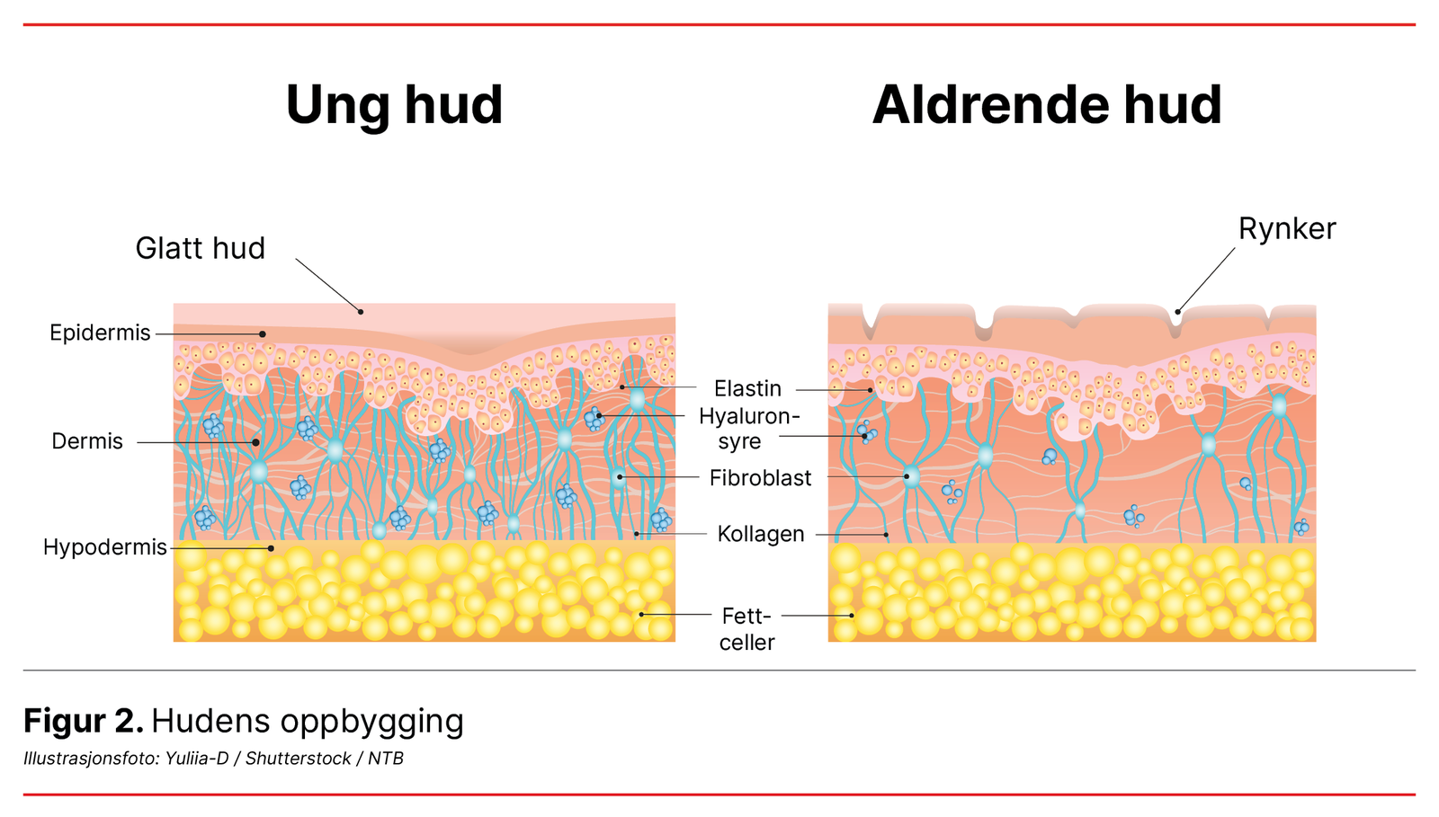 Hos eldre er huden tynnere, skjørere og tørrere på grunn av endringer i blodkar, svettekjertler og talgkjertler. I tillegg er produksjonen av elastin og kollagen nedsatt (17) (se figur 2). Nevnte aldersforandringer i huden gjør at eldre er spesielt utsatt for hudflenger og bør derfor følges ekstra nøye opp (4, 11, 17).