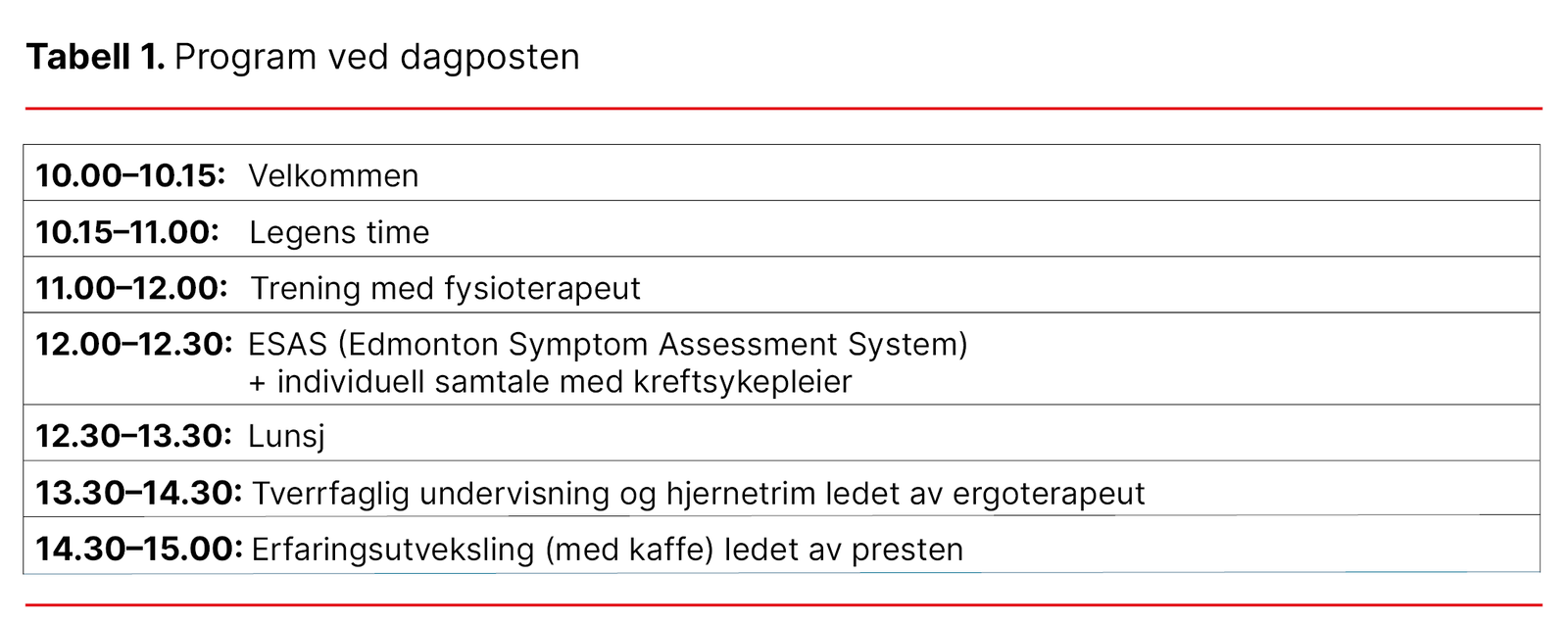 På et senter for kreftbehandling i Norge startet man i 2015 et ukentlig gruppetilbud med et tilpasset dagsprogram for pasienter med HGG (se tabell 1).