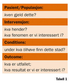 Kva spørsmål ein har, avgjer kva forskingsbasert kunnskap ein søker. Ofte vil ’best tilgjengeleg kunnskap’ for sjukepleiarar ha utgangspunkt i kjernespørsmåla ii”Kvifor skjer…?”, ”Korleis opplevast…?” og ”Kva erfaring…?” (10). Men uansett kva ein ønskjer å vite meir om; det er viktig å arbeide systematisk med spørsmålet som ligg til grunn for søket ein gjer. Presise spørsmål gir gode litteratursøk, og frå engelsk litteratur kjenner vi huskeregelen PICO: Patient/Problem, Intervention, Comparison, Outcome (10). PICO er laga for effektspørsmål, men kan omskrivast til vårt føremål: