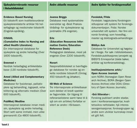 I Noreg har helsepersonell gratis tilgang til fleire helsefaglege databasar via Helsebiblioteket, som Cinahl, Medline og Embase, med mange kvalitative studiar av sjukepleie. Helsebiblioteket gjev også tilgang til Evidence Based Nursing, eit viktig tidskrift for kvalitetsvurdert forsking innan sjukepleie. Redaksjonen her overvakar andre tidsskrift, plukkar ut og vurderer relevante studiar - med ein eigen sesjon for kvalitativ forsking. Kvalitativ forsking er imidlertid ofte publisert som monografiar iii, tilgjengeleg i andre kjeldar enn dei store internasjonale databasene, så ein må vere merksam på supplerande kjelder til Helsebiblioteket. Tabell 2 gir ei oversikt over ulike litteraturkjelder og kva dei inneheld: