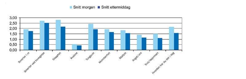 Det kan leses en klar tendens til positiv utvikling på alle parametere fra utfylling av skjema på morgenen til samme skjema på ettermiddagen. Kan sosialt felleskap gi lindring på flere områder?
