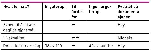 Legg LA, Drummond AE, Langhorne P. Occupational therapy for patients with problems in activities of daily living after stroke. Cochrane Database of Systematic Reviews 2006, Issue 4. (Bearbeidet fra artikkel skrevet av Claire Glenton, Nasjonalt kunnskapssenter for helsetjenesten.)