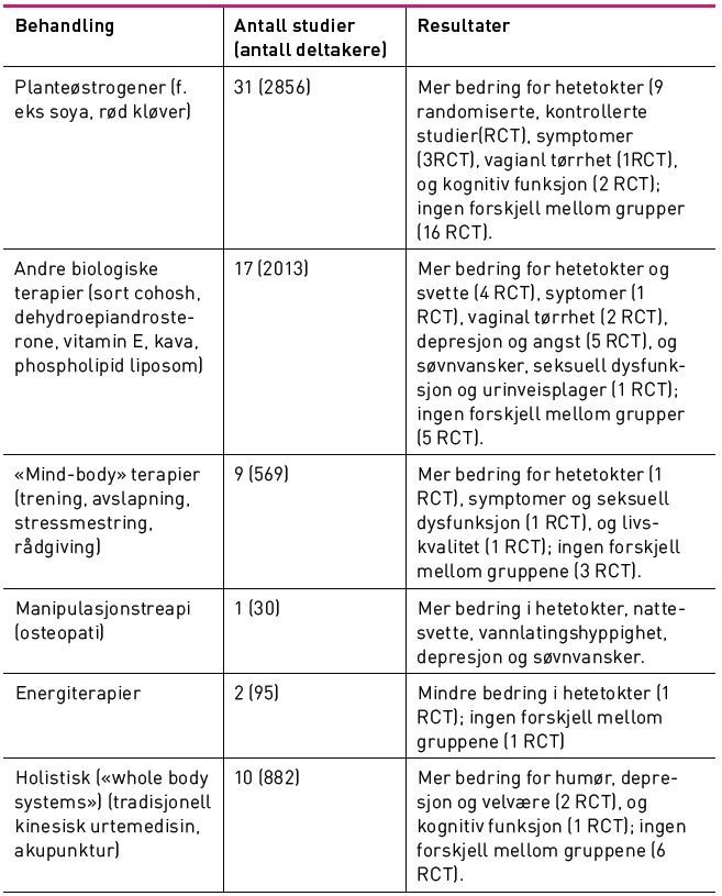 Studieseleksjon og vurdering: Randomiserte, placebokont rol ler te studier og meta-analyser som evaluerte alternative behandlingsformer (kategorisert av National Center for Complementary and Alternative Medicine) for kvinner i menopausen eller etter menopausen (også kvinner med brystkreft). 70 randomiserte kontrollerte studier (RCT) møtte inklusjonskriteriene. 48 testet biologisk baserte terapiformer (inkludert 31 med planteøstrogener), ni testet «Mind-body» terapier, og ti testet holistiske behandlingssystemer. Metodisk kvalitet for de fleste studier var moderat eller dårlig.