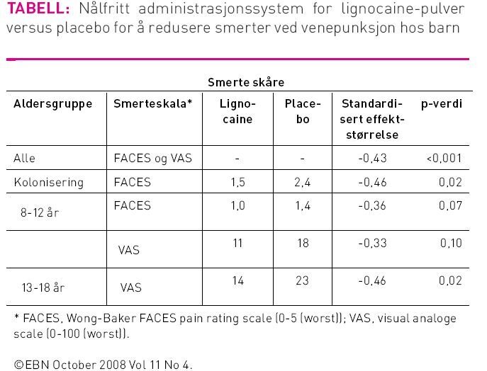 Hovedresultater Totalt viste studien at nålfritt administrasjonssystem for lignocaine- pulver reduserte smerter ved venepunksjon mer enn placebo (tabell). Smerter ved venepunksjon ble redusert for den yngste og den eldste aldersgruppen. Smerter ble ikke redusert i den midterste aldersgruppen, disse rapporterte mindre smertenivå enn de andre gruppene (tabell). Ubehag var minimalt for alle barn. Bivirkninger var få, sjeldne og lik for alle grupper, bortsett fra mildt erythem som forekom oftere i intervensjonsgruppen etter 30 minutter (19 prosent versus 3 prosent).