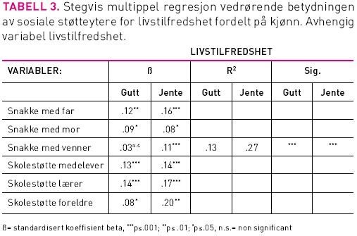 Ungdommene skårte generelt høyt på livstilfredshet. Standardavvikene var lave, og konfidensintervallene viste at det er liten spredning i materialet. Guttene rapporterte høyere livstilfredshet enn jentene (tabell 1). Over 80 prosent av det totale utvalget vurderte å kunne motta middels til høy grad av sosial støtte. En høyere andel av ungdommene fant det lett å henvende seg til mor ved problemer, sammenlignet med far. Gutter skårte gjennomsnittlig høyere enn jentene på problemrelatert støtte fra far (3,5 versus 3,2, variasjonsbredde 1-5). Begge kjønn skårte gjennomsnittlig høyt på støtte fra bestevenn, og jenter skårte høyere enn gutter (jenter 4,5 gutter 4,1, variasjonsbredde 1-5). Tilsvarende tendens ble observert for å snakke med venn av samme kjønn (gjennomsnitt gutter 3,9, jenter 4,2, variasjonsbredde 1-5). Sammenlignet med lærere og medelever oppnådde foreldre den høyeste gjennomsnittsverdi (gjennomsnitt = 4,3, variasjonsbredde 1-5) når det gjaldt sosial støtte i skolesammenheng. Medelever og lærer hadde en gjennomsnittlig skåre på henholdsvis 3,8 og 3,5. Det var ingen signifikant forskjell på kjønnene i den støtte de opplevde å få fra foreldre, lærer og medelever i skolesammenheng (tabell 1). Samlet sett forklarte sosial støtte dobbelt så mye av variansen (R2x3) i jenters livstilfredshet sammenlignet med gutters livstilfredshet (Jenter: R2x3=,27, gutter: R2x3=0,13). For gutter var det støtte fra lærer (=0,14), etterfulgt av støtte fra medelever (=0,13) og problemrelatert støtte fra far (=0,12 p=0,003), som var av størst betydning for å forklare variansen i livstilfredshet. For jenter var det skolerelatert støtte fra foreldre som innehadde den høyeste betaverdien (=0,20), etterfulgt av støtte fra lærer (=0,17), problemrelatert støtte fra far (=0,16) og støtte fra medelever (=0,14) (tabell 2).