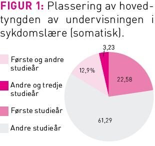 AFB ble ved samtlige studiesteder undervist og vurdert i første studieår, selv om noen undervisningsinstitusjoner hadde lagt et mindre antall studiepoeng i dette emneområdet seinere i studiet. I sykdomslære var studiepoengene ofte fordelt over flere studieår og inngikk i flere emner/moduler. Vi har i denne studien hovedsakelig studert den somatiske delen av sykdomslæreundervisningen, og har valgt å fokusere på når i studiet hovedtyngden av undervisningen var plassert (figur 1).