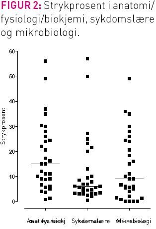 Det er stor variasjon i strykprosenter mellom studiestedene. Studien vår gir ikke svar på hvorfor det er så store forskjeller, men forskjellene er større enn det som med rimelighet kan forklares ut ifra variasjoner i studentmassen fra studiested til studiested. Poengopptaksgrense til studiet kan være av betydning. Men også andre faktorer som undervisningsmetoder, stoffvalg og forventet kunnskapsnivå til eksamen, kan tenkes å påvirke strykprosenten. Imidlertid kan det, ut ifra våre funn, se ut til at vurderingsformen har konsekvenser for strykprosent. Strykprosenten var høyere ved skoleeksamen enn ved mappe-/ hjemmeeksamen. Dette er i samsvar med resultatene fra to norske surveyer om mappevurdering i høgere utdanning (22). Når det gjelder funnene i vår studie, kan det tenkes flere forklaringer på forskjellene i strykprosent mellom ulike eksamensformer. En mulig faktor kan være at studentene har hjelpemidler tilgjengelige ved mappe-/hjemmeeksamen. En annen mulig forklaring kan være at mappeeksamen gir bedre læringsutbytte og dermed høyere kunnskapsnivå, noe også Engelsen og Dysthe (2008) diskuterer (22). Et annet moment er eksamensinnholdet. Mappe-/hjemmeeksamenene er ofte integrert med sykepleie/sykepleieemner, og derfor innholdsmessig forskjellige fra storparten av skoleeksamenene. Dette kan gjøre det vanskelig å sammenligne skoleeksamener og mappe-/hjemmeeksamener direkte. Tallene må også tolkes med forsiktighet på grunn av at særlig gruppen mappe-/hjemmeeksamener er liten. Det er også for få flervalgseksamener til å trekke sikre konklusjoner om strykprosent ved disse sammenlignet med andre eksamensformer. Vi fant at strykprosent i AFB var signifikant høyere enn i sykdomslære. Mulige forklaringer på dette kan være fagets egenart med mange nye begreper og fremmedord. Samt at eksamen i AFB kommer tidlig i studiet, og at studentene derfor ikke er vant med eksamener på høyskolenivå. I så fall ville det være interessant å se om høyere strykprosent er vanlig ved tidlige eksamener også ved andre studier. Det er viktig å være klar over begrensningene ved å bruke strykprosent og karakterskala ved de enkelte eksamenene som mål på studentenes evne til å nyttiggjøre seg kunnskapen senere. Trnobranski (1993) peker på betydningen av naturvitenskapelig kunnskap i sykepleieryrket og nevner behovet for å finne ut hva slags naturvitenskapelig kunnskap som er anvendbar i sykepleierens praksis (23). Hos en ferdig utdannet sykepleier bør den medisinske og naturvitenskapelige kunnskapen være en integrert del av den startpakken sykepleieren tar med seg ut i yrkeslivet. Det blir da et spørsmål om hvordan en best ivaretar dette. Davies et al. (2000) fant ingen klar preferanse hos sykepleiestudentene for en bestemt læringsstrategi i de naturvitenskapelige fagene, men mange ønsket mer undervisning i smågrupper (24). Dette kan gi mulighet for å flytte fokus fra en ren lærerstyrt undervisningsmodell til et læringsfellesskap der studentene er mer delaktige, og der læreren i stedet for å overføre kunnskap direkte til studentene, fungerer som en støtte for studentenes kunnskapsbygging (25).