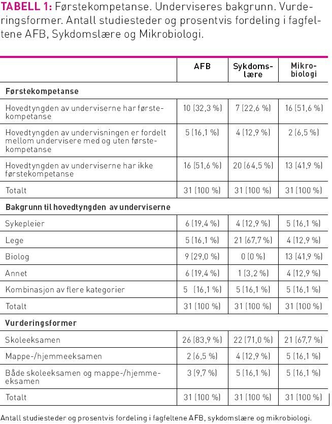 Tabell 1 viser også hvilke vurderingsformer som ble brukt ved formelle eksamener. I en del tilfeller vurderes flere emner ved samme eksamen. Mikrobiologi inngikk i 19 (65,5 prosent) av 29 skoleeksamener i AFB. En av skoleeksamenene i AFB var integrert med sykepleie/sykepleieemner. Av totalt fem mappe-/hjemmeeksamener der AFB inngikk, var samtlige integrert med sykepleie/ sykepleieemner. Og fire av dem var integrert med mikrobiologi. Flervalgstest (multiple choice) ble benyttet ved tre (10,3 prosent) av skoleeksamenene i AFB. I sykdomslære var det en betydelig forskjell mellom skoleeksamener og mappe-/hjemmeeksamener når det gjaldt integrering med sykepleieemner. Av til sammen 27 studiesteder, som benyttet skoleeksamen i sykdomslære, var det kun tre (11,1 prosent) som integrerte sykdomslære i skoleeksamen sammen med sykepleie. Derimot var samtlige mappe-/hjemmeeksamener der sykdomslære inngikk, integrerte eksamener som også inneholdt sykepleie/sykepleieemner. Ved tre studiesteder ble det brukt flervalgstest ved skoleeksamen i sykdomslære. Mikrobiologi vurderes ofte integrert med andre emner, gjerne AFB og/eller sykepleie. Kun fem (19,2 prosent) av 26 skoleeksamener og en (10 prosent) av ti mappe-/hjemmeeksamener der mikrobiologi inngikk, var egne eksamener i mikrobiologi, eventuelt kun kombinert med hygiene/smittevern/ infeksjon. Flervalgstest ble benyttet ved fire (15,4 prosent) av skoleeksamenene og ved en mappe-/ hjemmetest i mikrobiologi. Vi har sammenlignet underviseres bakgrunn og valg av vurderingsformer. Tre av seks studiesteder, der hovedtyngden av underviserne i AFB var sykepleiere, benyttet mappe-/hjemmeeksamen, enten alene eller i tillegg til skoleeksamen. Mens ingen av de ni studiestedene der hovedtyngden av underviserne i AFB var biologer, brukte mappe-/ hjemmeeksamen. Denne forskjellen var signifikant (Fishers eksakte test, p=0,044 ved tosidig test). Når det gjelder sykdomslære, fant vi at av 21 studiesteder der hovedtyngden av undervisningen ble foretatt av leger, brukte 16 (76,2 prosent) kun skoleeksamen. Mens bare ett av fire studiesteder der hovedtyngden av underviserne var sykepleiere, benyttet skoleeksamen som eneste vurderingsform i dette emnet. Forskjellen var ikke signifikant (Fishers eksakte test, p=0,081 ved tosidig test). Det er her ikke regnet med de studiestedene der hovedtyngden av undervisningen var fordelt mellom flere yrkeskategorier.