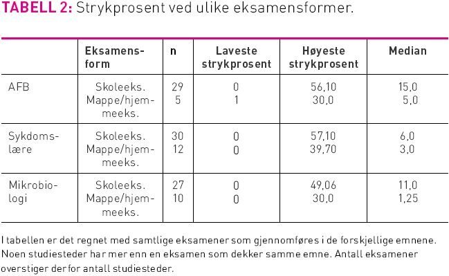 For studiesteder som hadde flere eksamener der samme fagfelt inngikk, viser figuren gjennomsnittlig strykprosent for disse eksamenene. Målt på denne måten var strykprosenten i AFB signifikant høyere enn i sykdomslære (Wilcoxon Signed Ranks Test, p=0,01), mens det ikke var signifikant forskjell på strykprosenten i mikrobiologi og sykdomslære (p=0,294). Det er vanskelig å gjøre en reell sammenligning mellom strykprosent i AFB og mikrobiologi fordi disse fagområdene svært ofte ble testet i felles eksamen. Det var ingen signifikant forskjell i strykprosent mellom de 15 studiestedene som tok opp 100 heltidsstudenter eller mindre, og de 16 studiestedene som tok opp mer enn 100 heltidsstudenter i studieåret 2007/2008. Dette gjaldt både AFB (Mann-Whitney U-test, p=0,41), sykdomslære (p=0,64) og mikrobiologi (p=0,84). Det var heller ikke signifikant forskjell i strykprosent mellom studiesteder der hovedtyngden av underviserne hadde førstekompetanse, og studiesteder der hovedtyngden ikke hadde førstekompetanse, verken i AFB (Mann-Whitney U-test, p=0,81), sykdomslære (p=0,70) eller mikrobiologi (p=1,00). Vi har også sammenlignet strykprosent ved samtlige skoleeksamener med strykprosent ved samtlige mappe-/hjemmeeksamener (tabell 2). Det var signifikant lavere strykprosent ved mappe-/ hjemmeeksamener enn ved skoleeksamener for alle fagområdene samlet (Mann-Whitney U-test, p=0,002). Også i hvert enkelt fagområde var det lavere strykprosent ved mappe-/hjemmeeksamener. Forskjellen var signifikant for sykdomslære (p=0,041) og mikrobiologi (p=0,014), men ikke for AFB (p=0,080).