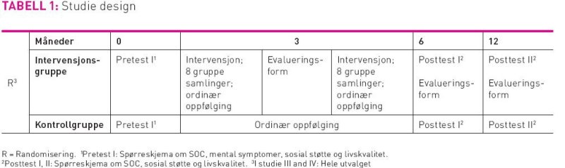 Metode: Prospektiv og randomisert kontrollert studie. Instrumenter er Sense of Coherence Questionnaire. Quality of Life Scale, Social Provisions Scale og Symptom Checklist-90. Utvalget består av 107 hjemmeboende personer med psykiske helseproblemer. Statistiske analyser er Univariat kovarians analyse og multippel lineær regresjons analyse.