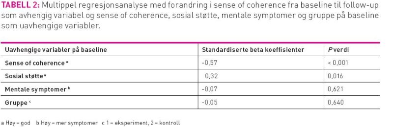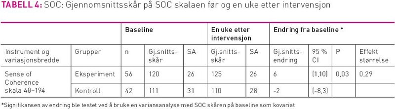 amtalegrupper basert på salutogene terapiprinsipper resulterte i en signifikant forbedring av SOC med åtte poengs forskjell mellom eksperiment og kontrollgruppe (p = 0,03). Se tabell 4. 69 prosent av dem som deltok i samtalegruppene bedret sin SOC. I tillegg viser deltakerens egen evaluering av intervensjonen at mellom 70 og 95 prosent opplevde samtalegruppen som svært nyttig eller nyttig for deres psykiske helse i hverdagen (25).